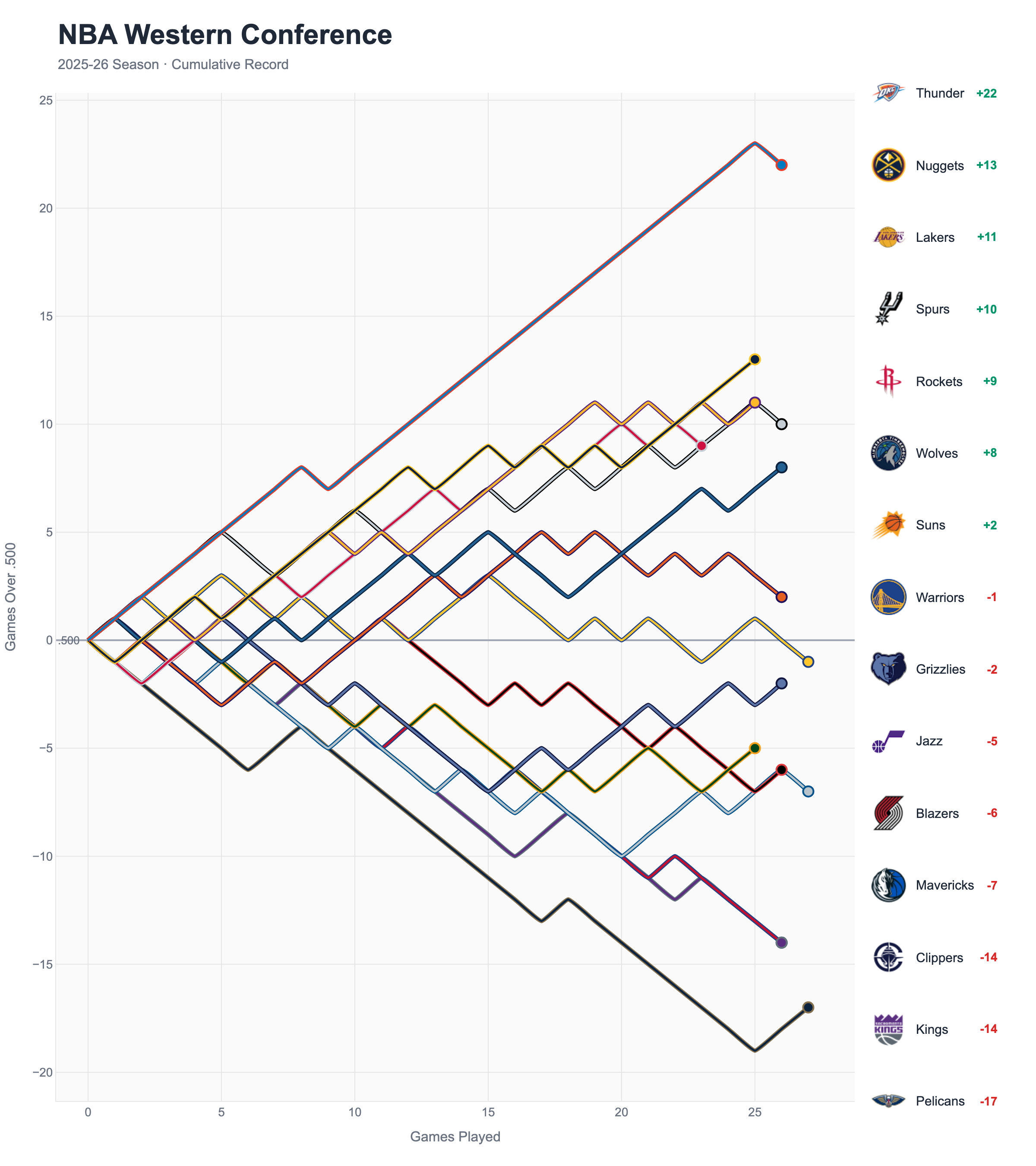 Weekly graphs tracking every team's win-loss record progression throughout the season.